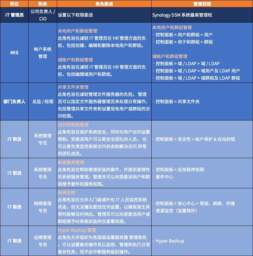那么二级权限可以如何解决这些难题呢?系统管理员可以让部门负责人、MIS、系统管理、网络管理、运维管理等各司其职,以此降低管理员工作压力,提升管理灵活性。以下表简单分类示意,在二级权限中,可以如何委派管理权限: