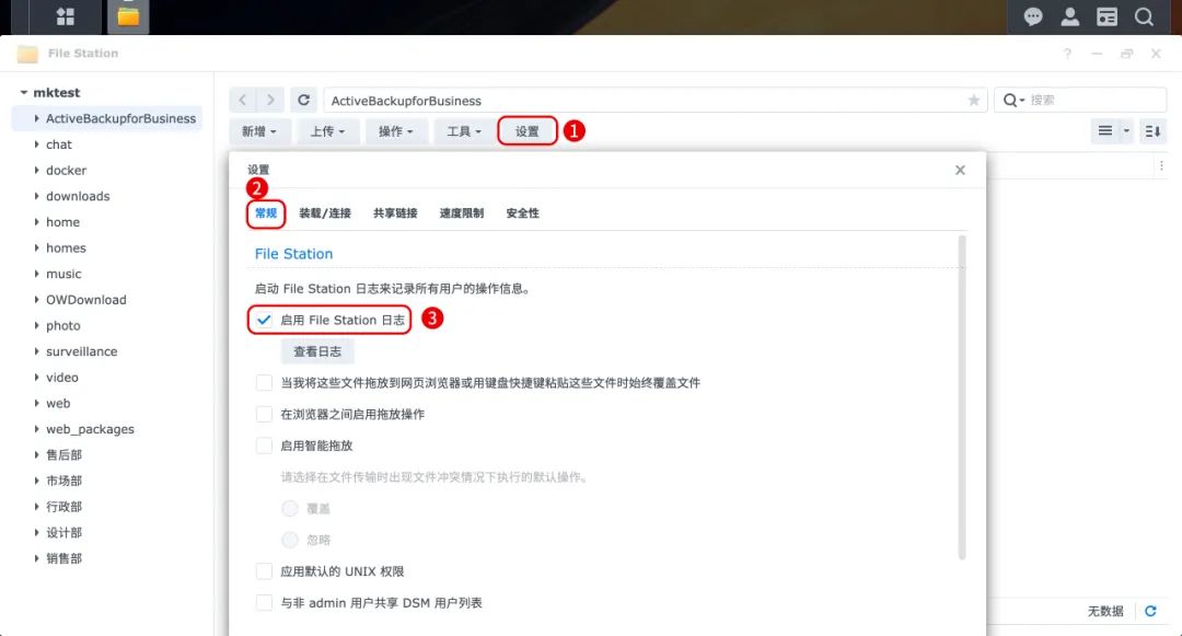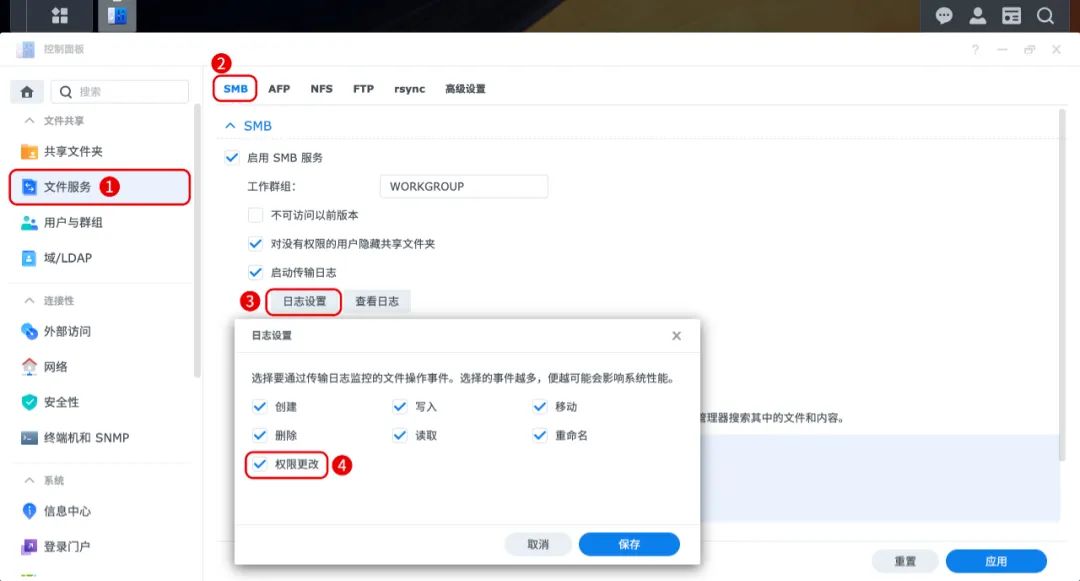 而以往通过SMB在电脑本地进行权限更改时,系统日志无法记录,管理人员在进行日志追溯时,容易遗漏重要信息,同时日志归档信息也不完整。在DSM 7.0中,日志支持记录权限更改,在File Station或是SMB里进行设置均可以开启权限更改记录。