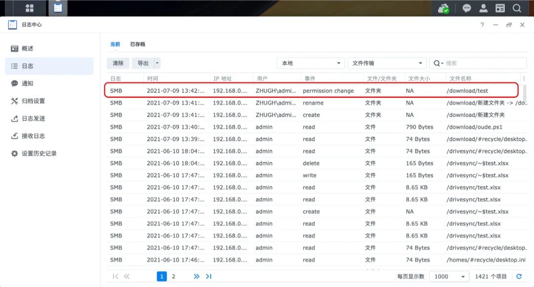 当具有更改文件夹权限的帐户在本地更改权限时,日志中心就会记录该信息,管理员就能通过日志中心统一进行监管和归档。此外,在通过SMB访问时,对没有权限的用户可以设置隐藏共享文件夹。