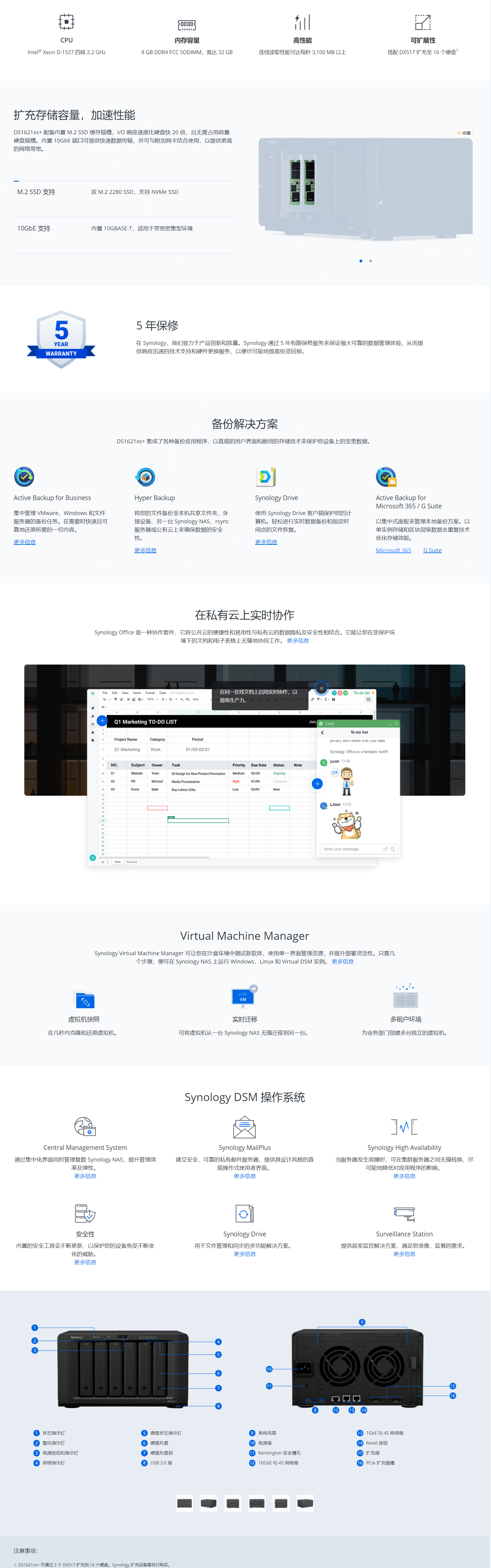 DS1621xs+ 是一款具有服务器级性能的高端 NAS,采用 6 槽式台式外形规格。内置 M.2 SSD 缓存插槽、10GbE 端口、可扩充内存和可扩展存储设计使您可以提升 NAS 的性能,使其成为需要高效且节省空间的存储解决方案的中小型企业的理想选择。