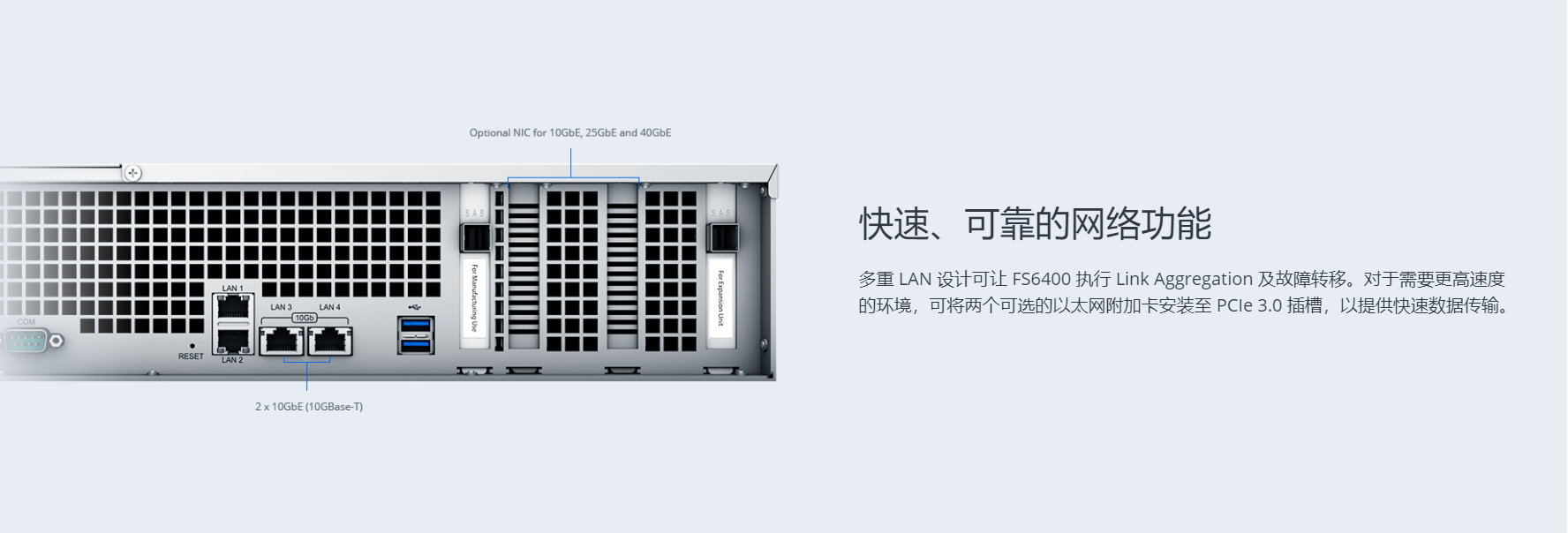 Synology FlashStation FS6400 是专为 I/O 密集型和延迟敏感型应用程序而设计的 2U 机架式服务器,十分适用于多媒体后期制 作、虚拟机、在线事务处理或数据库应用程序。