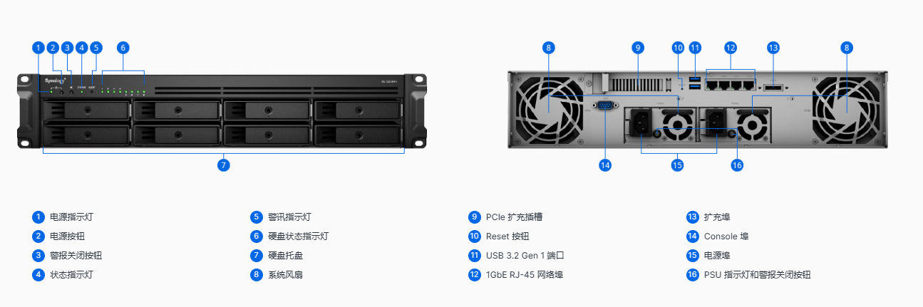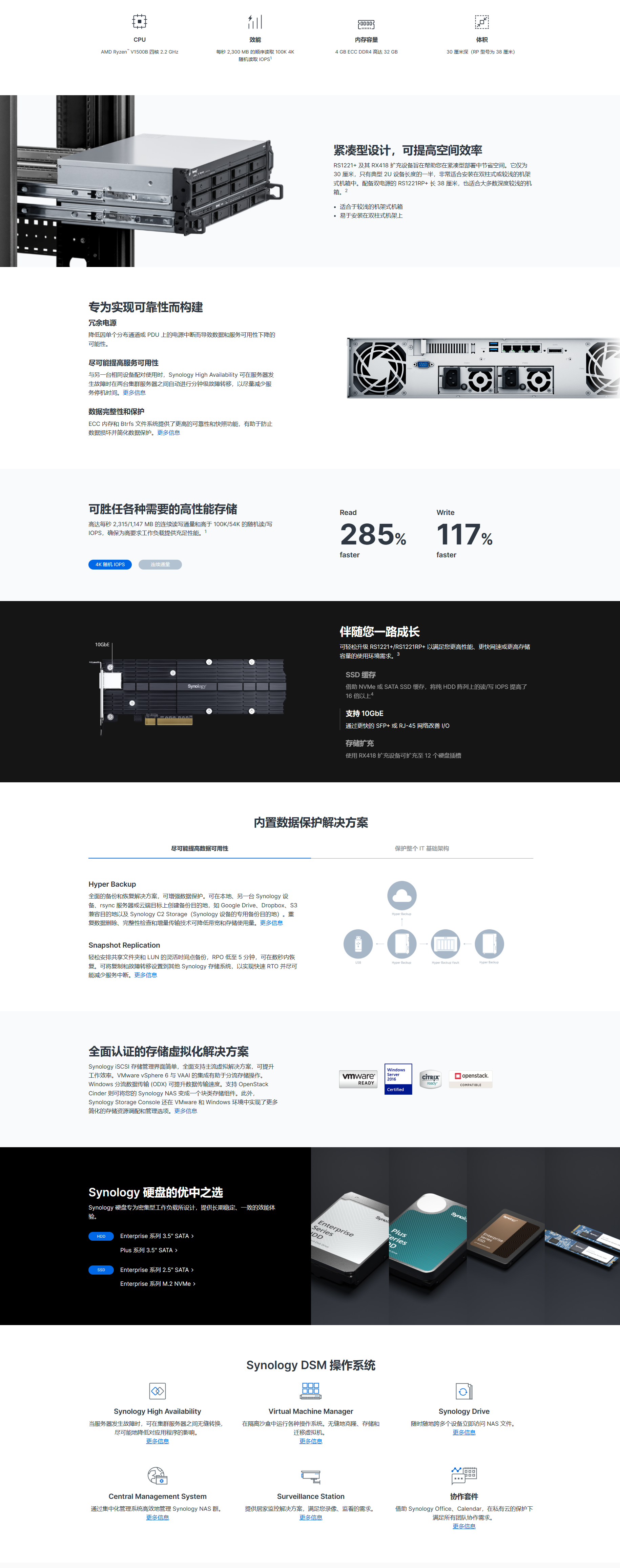 RS1221+/RS1221RP+ 深度只有 30 到 38 厘米,专为对空间敏感的部署而打造。RS1221+/RS1221RP+ 拥有高于 100K 的 4K 随机读取 IOPS 和每秒 2,315 MB 的连续读取速度*1,可在数据密集型环境中处理繁重的工作负载。此外,RS1221RP+ 还具有额外的冗余电源保护功能。
